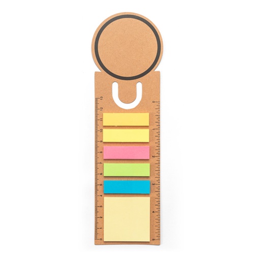 Set de bureau 3 en 1 fabriqué à partir de papier 100 % recyclé, avec un dessus arrondi et une impression noire sur les bords. Il comprend un bloc-notes autocollant (60 g/m²) de 15 feuilles de papier 100 % recyclé de couleur jaune et cinq petits blocs-notes autocollants de 15 feuilles chacun, fabriqués à partir de papier 100 % recyclé de différentes couleurs : orange, jaune, rose, vert clair et bleu. Deux règles sont situées dans les marges : celle de gauche est graduée en centimètres (cm) et celle de droite en pouces. Sa polyvalence lui permet d'être utilisé comme marque-page ou comme trombone lorsqu'il est fixé à un ensemble de feuilles 215 x 60 mm