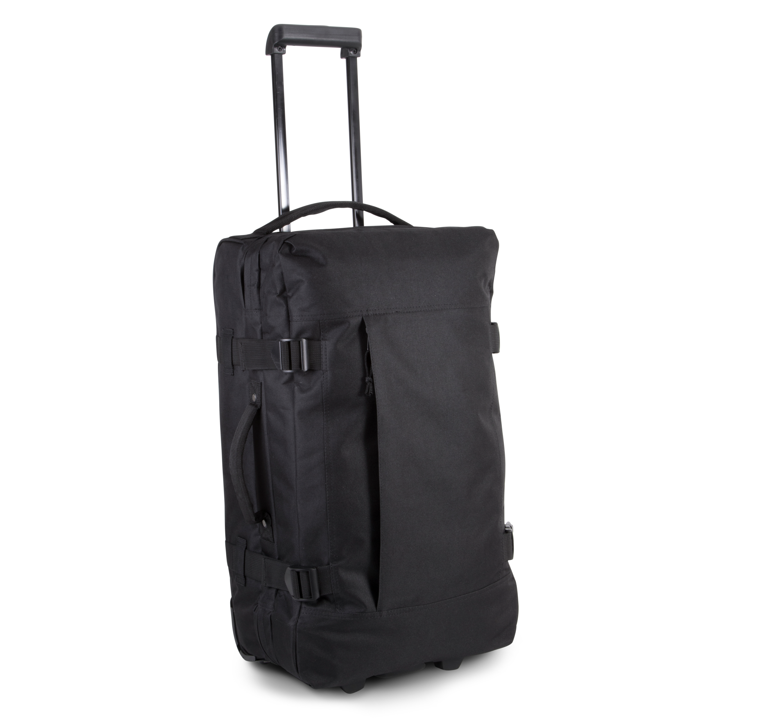 Sac trolley en polyester 600D avec grande poche zippée à l'avant pour faciliter la personnalisation. 2 compartiments internes avec sangles de maintien. Système de trolley rétractable. Sangles extérieures pour ajuster le volume. Base avec renforcement en relief et points d'arrêt sur les poignées.Grande poche zippée à l'avant pour faciliter la personnalisation.2 compartiments internes avec sangles de maintien.