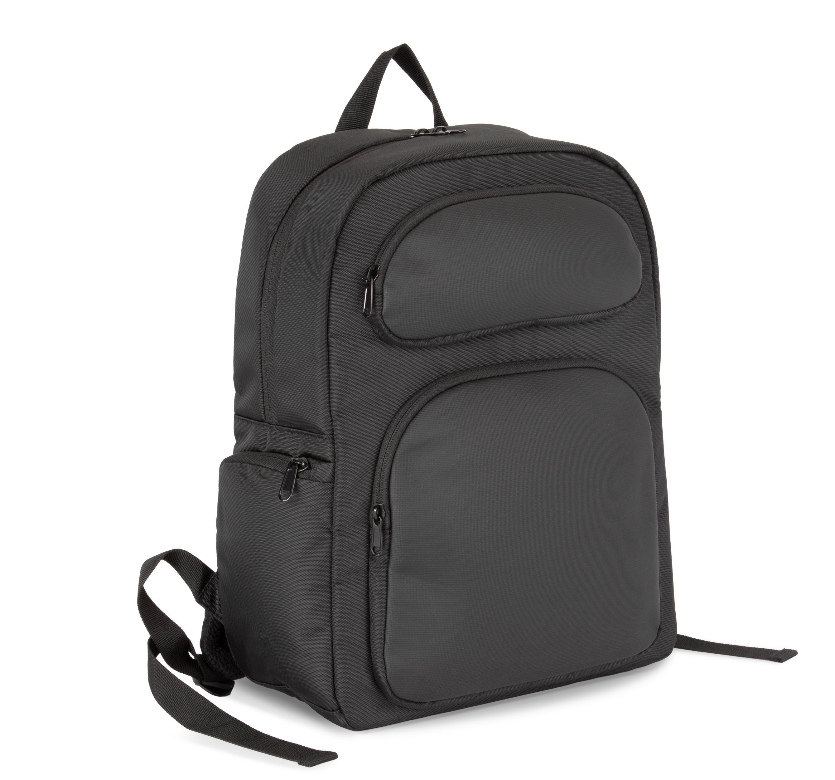 100% polyester. Sac à dos avec double poche frontale facilitant la personnalisation. Poches latérales pour petits objets. Compartiment principal avec emplacement pour ordinateur portable et tablette. Mousqueton porte-clés intégré. Multiples poches de rangement internes, dont une principale en mesh zippée. Bretelles ergonomiques, réglables et rembourrées. Dos rembourré et respirant avec bande pour fixation sur la poignée d’un trolley, pour un transport facilité. Poche de sécurité arrière pour ranger passeport et téléphone.Double poche frontale facilitant la personnalisation.Compartiment principal avec emplacements PC et tablette.Dos respirant avec fixation trolley.0 g/m²