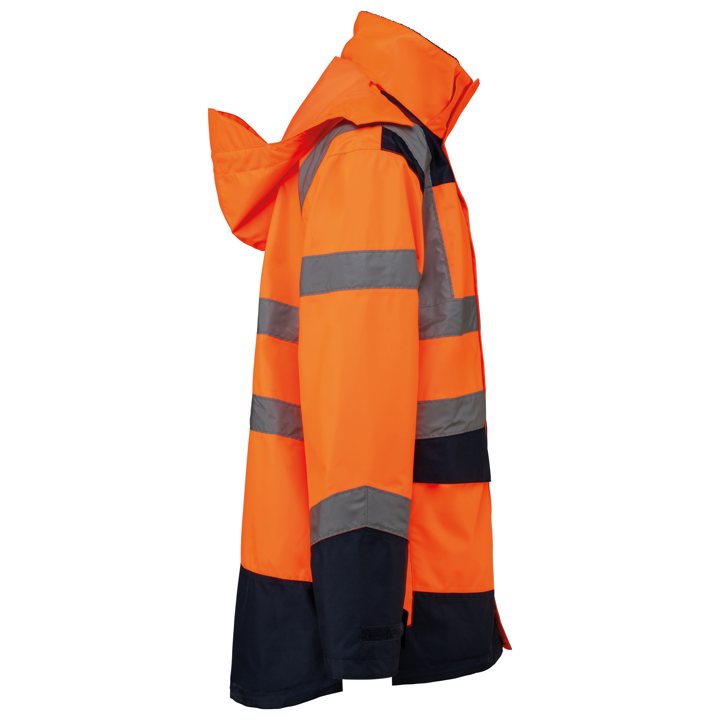 100% polyester recyclé. Tissu oxford avec enduction PU. Traitement imperméable et coutures thermosoudées étanches. Lavage 40°C . Fermeture zippée double curseur avec tire zip dissimulée sous patte fermée à l’aide de bandes auto agrippantes. Doublure intérieure corps et manches en mesh 100% polyester. 2 poches côtés verticales zippées + 2 poches horizontales avec rabats fermées à l’aide de bandes auto agrippantes. 1 poche poitrine zippée dissimulée sous la patte sur le coté gauche au porté. Poignets réglables par bandes auto agrippantes. Intérieur col contrasté en polaire 100% polyester avec lien d’accrochage. Capuche amovible zippée doublée en mesh et ajustable à l’aide de cordons de serrage élastiqués et de bandes auto agrippantes. Poche de rangement pour la capuche dissimulée dans le col et fermée par bandes auto agrippantes. Empiècements contrastés sur épaules, bas de manches, bas de vêtement et rabats de poches. Bandes segmentées rétro réfléchissantes de 5 cm sur épaules, poitrine, corps et manches, devant et dos. 1 zip poitrine + 1 poche plaquée fermée par bande auto agrippante côté intérieur gauche au porté. 1 zip de personnalisation intérieur au bas du vêtement. Bas du vêtement réglable à l’aide de cordons de serrage élastiqués. Veste intérieure réversible : 100% polyester recyclé. Tissu oxford avec enduction PU. Traitement imperméable et coutures thermosoudées étanches. Lavage 40°C (25 cycles). Fermeture zippée avec curseur réversible et tire zip. 2 poches côtés verticales zippées. 1 poche poitrine zippée côté droit au porté. Finition bord côtes 2x2 bas de manches. Empiècements contrastés haut du corps devant, bas de manches et bas de vêtement, devant et dos. Bandes segmentées rétro réfléchissantes de 5 cm sur corps et manches, devant et dos. Côté réversible : 100% polyamide. Tissu taffeta avec enduction PA et rembourrage. 2 poches côtés verticales zippées. Lien d’accrochage intérieur col. 1 zip de personnalisation invisible au bas du vêtement dissimulé dans une couture. Les vêtements sont liés entre eux par un système de zip sur le milieu devant ainsi que des boutons avec liens d’accrochage dans le col et les manches. EPI Classe II. Normes NF EN ISO 13688:2013 + NF EN ISO 13688/A1:2021 (Vêtements de protection - Exigences générales), NF EN ISO 20471:2013 + NF EN ISO 20471/A1:2017 : Parka extérieure - Classe 3, Veste intérieure - Classe 2 (Vêtements à haute visibilité - Méthodes d’essai et exigences), NF EN 343:2019 : Classe 3 : 3 uniquement pour la parka extérieure (Habillement de protection - Protection contre la pluie), RIS-3279-TOM Issue 2:2019 uniquement pour la couleur Hi Viz Orange/Navy (Norme de l’industrie ferroviaire). Etiquette de marque détachable.Veste polyvalente 4 en 1 pour s'adapter à toutes les situations.Vêtement haute visibilité et résistant aux intempéries.Fabriquée en polyester recyclé.200 g/m²